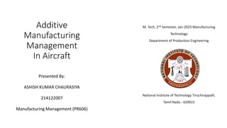 The document discusses the impact of additive manufacturing (AM) on the aircraft supply chain, emphasizing its role in enhancing supply chain performance and inventory management through system dynamics modeling. It highlights challenges faced by SMEs in accessing production-grade metal AM systems and the potential of integrating AM in remanufacturing processes. Additionally, it presents research on optimizing remanufacturing hub locations using facility location models and compares costs of AM methods in reverse logistics.