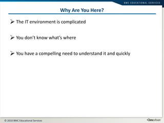 The document discusses the challenges of understanding complex IT environments and outlines the requirements of an effective baseline process. It then introduces BMC Atrium Discovery as a solution that is agent-free, extensible, low impact, and scalable. Atrium Discovery provides automatic discovery of IT assets with monthly knowledge updates and graph-based mapping of configuration items and their relationships.