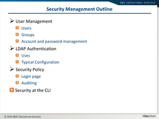 This document summarizes user administration and system security features in Tideway Foundation. It discusses user management including adding and managing users and groups. It also covers LDAP integration for authentication, configuring security policies like login pages and auditing, and managing active sessions and audit logs. System level accounts on the CLI are also mentioned.