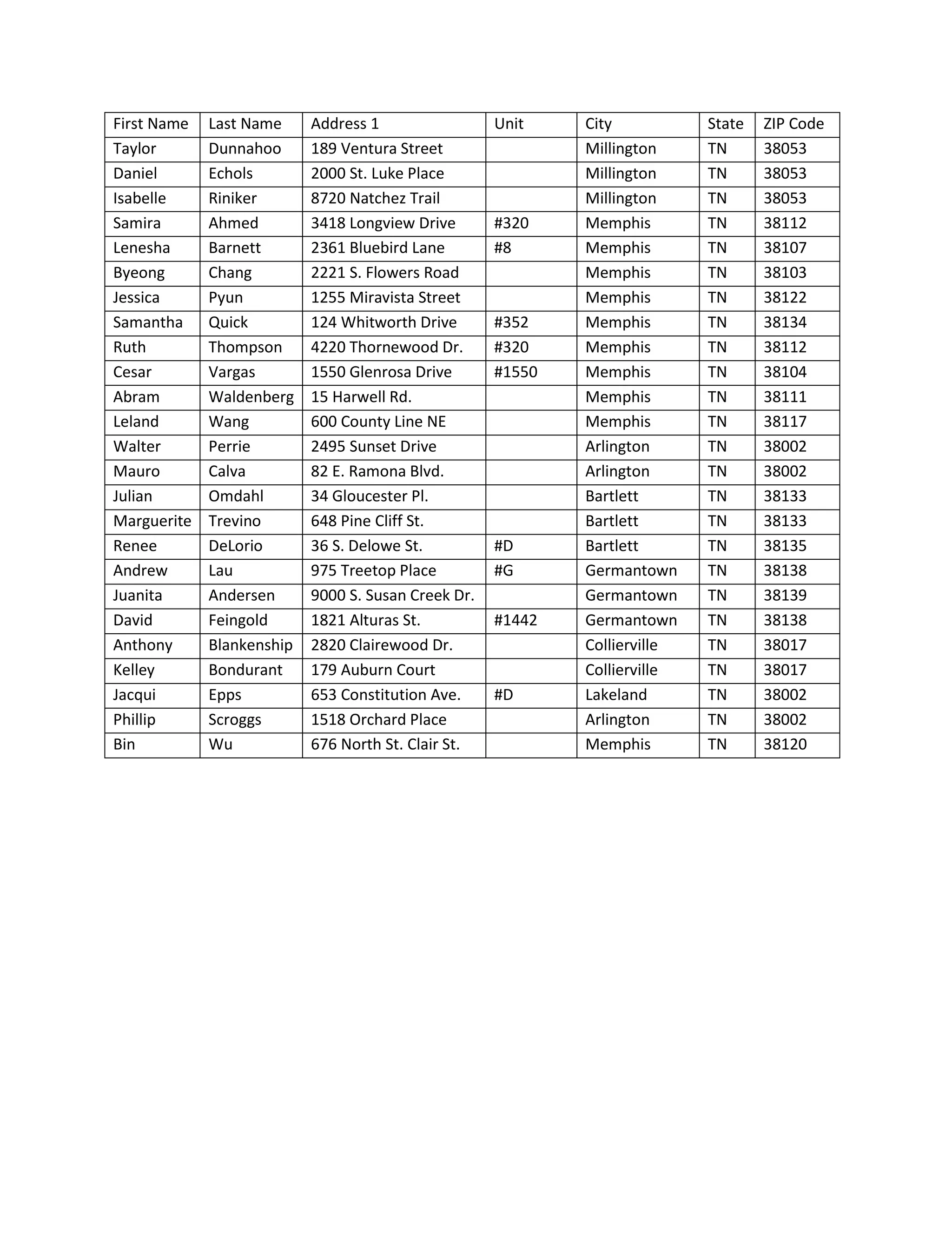 This document contains a list of names, addresses, cities, states and zip codes for 22 individuals residing in various cities in Tennessee including Millington, Memphis, Arlington, Bartlett, Germantown, Collierville and Lakeland. The addresses include street addresses, unit or apartment numbers, and zip codes. The states listed are all Tennessee.
