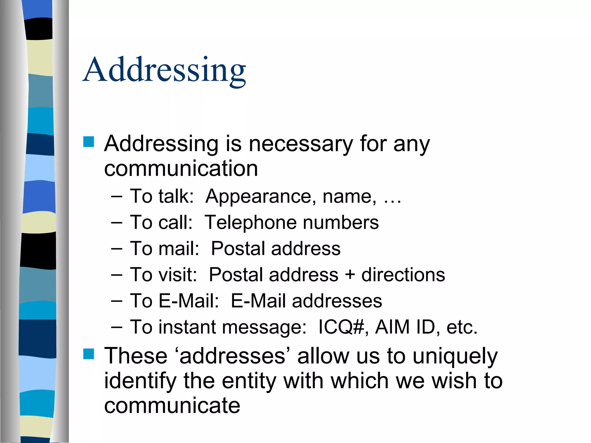 Addressing deals with uniquely identifying the location of an entity for communication purposes. It involves a name/identifier, address, and route. Addresses allow messages to be delivered to the intended destination. IP addresses in IPv4 are 32-bit numbers that identify devices on the network. IPv6 was developed to replace IPv4 and uses 128-bit addresses to overcome the address space limitations of IPv4. A transition approach is needed to integrate IPv6 since the internet cannot be abruptly changed over.