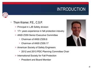 The document discusses fall protection anchorages, highlighting the importance of proper anchorage assessment according to OSHA and ANSI standards. It outlines the various types of anchorages, their required strengths, and the necessity for thorough documentation and evaluation of fall protection systems. Key considerations for improving fall protection at job sites are emphasized, including the need for certified anchorages and the importance of prevention through design.