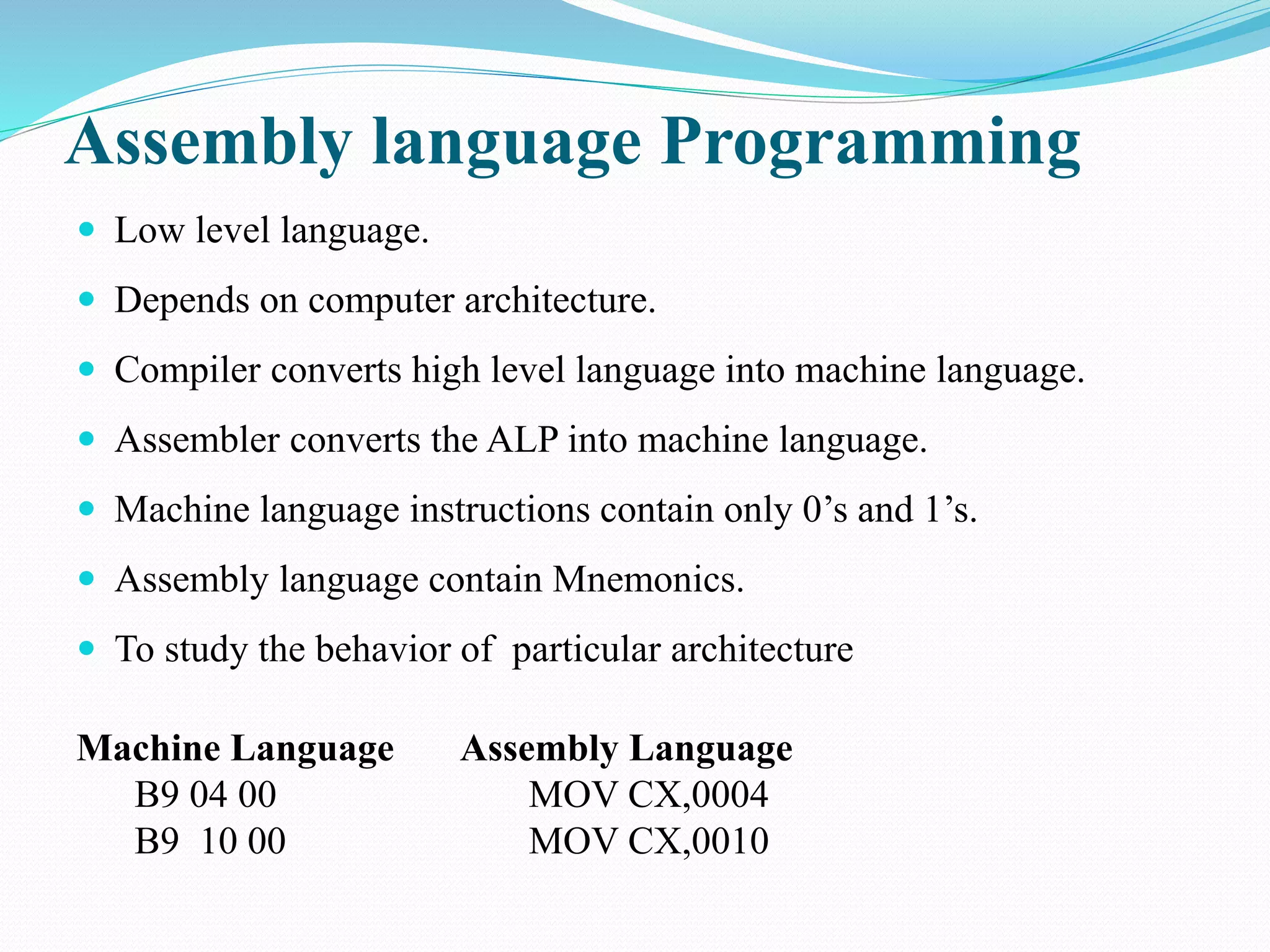 This document discusses assembly language programming. It provides an overview of assembly language, how it relates to machine language, and how assemblers are used to convert assembly code into machine-readable object code. It also describes the basic components of assembly language instructions, including opcodes and operands, and different addressing modes for specifying operands in memory or registers. Common addressing modes like immediate, register, direct, register indirect, and based indexed modes are defined through examples.