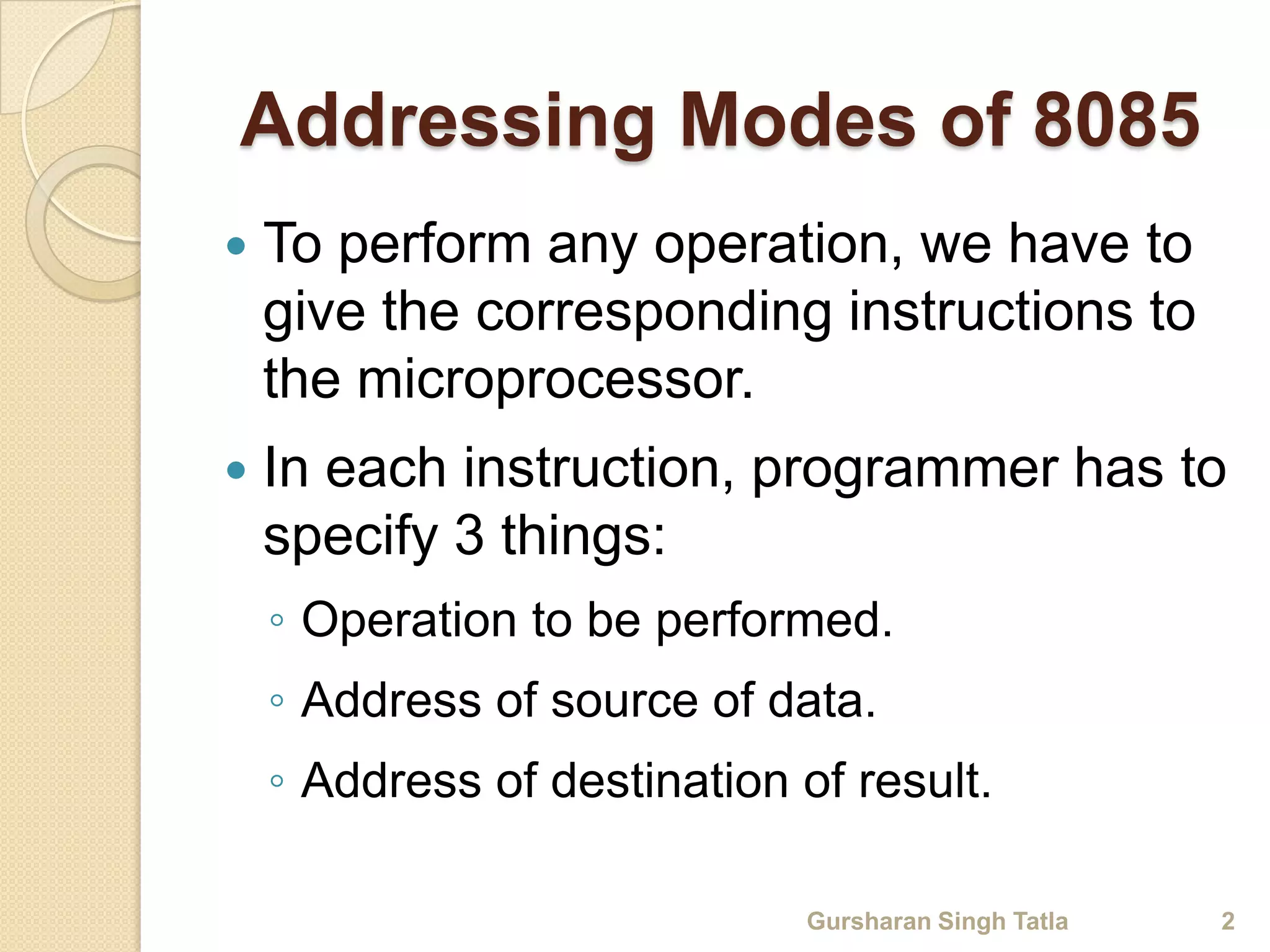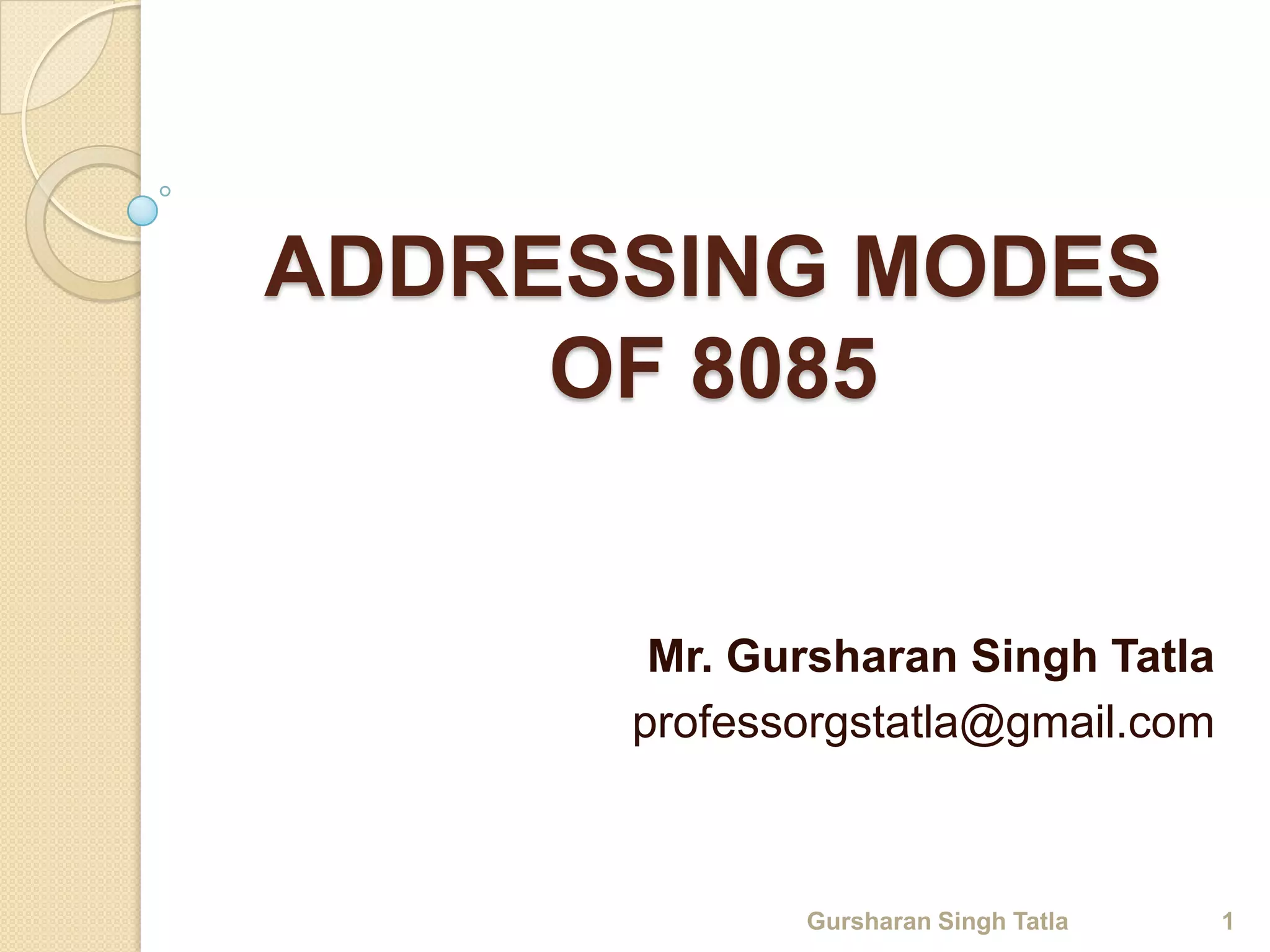 The document discusses the different addressing modes used by the Intel 8085 microprocessor. It describes 5 addressing modes: direct, register, register indirect, immediate, and implicit. Direct addressing specifies the operand address in the instruction itself. Register addressing uses processor registers as the operand. Register indirect addressing specifies the operand address using a register pair. Immediate addressing encodes the operand within the instruction. Implicit addressing has fixed source and destination registers, so no operands are needed.