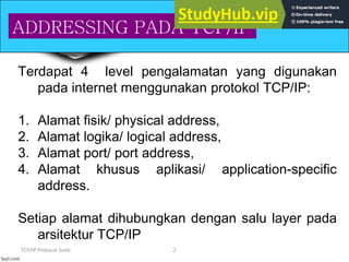 The document discusses the four levels of addressing used in TCP/IP: