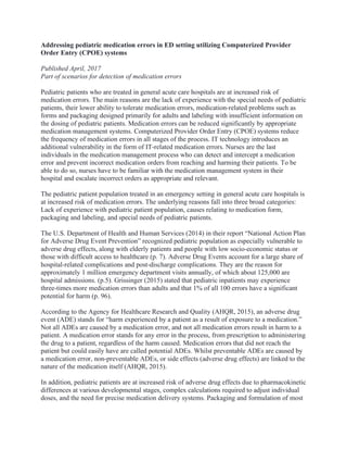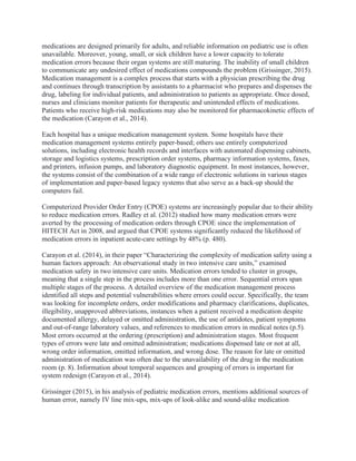 Pediatric patients in emergency settings are at a higher risk of medication errors due to challenges like insufficient experience with their unique needs, medication packaging primarily for adults, and IT-related errors. Computerized provider order entry (CPOE) systems can significantly reduce these errors but may also introduce new ones due to human-machine interaction. Nurses play a crucial role in intercepting errors and ensuring accurate medication administration, requiring comprehensive understanding of their hospital's medication management systems.