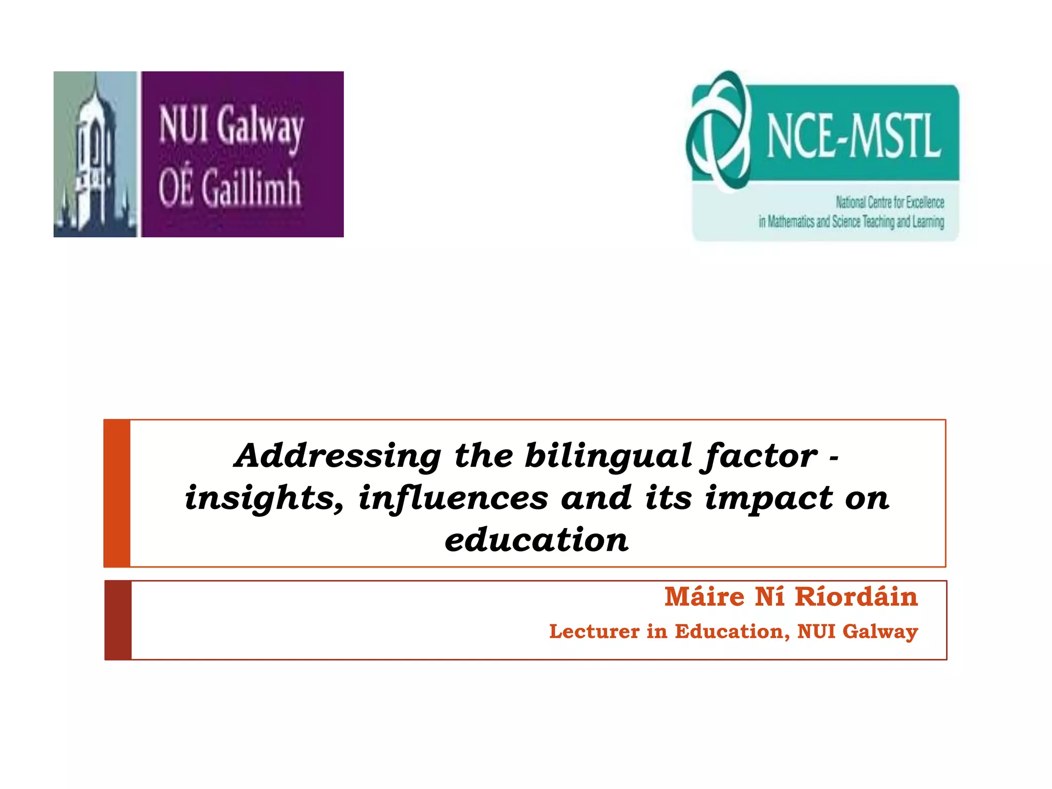 This document discusses the impact of bilingualism on education from historical, socio-political, and research perspectives. It traces the history of the Irish language in Ireland from dominance pre-16th century to decline during colonization. Research shows cognitive advantages for bilingual students, like greater flexibility, if both languages meet a threshold level. Additive bilingual models correlate with positive outcomes, while subtractive models correlate with negative outcomes. Irish research mirrors international findings, with bilingual students outperforming monolingual peers in math and other subjects. The conclusion is that bilingualism can make you smarter when implemented well through additive programs versus compulsory subtractive models.