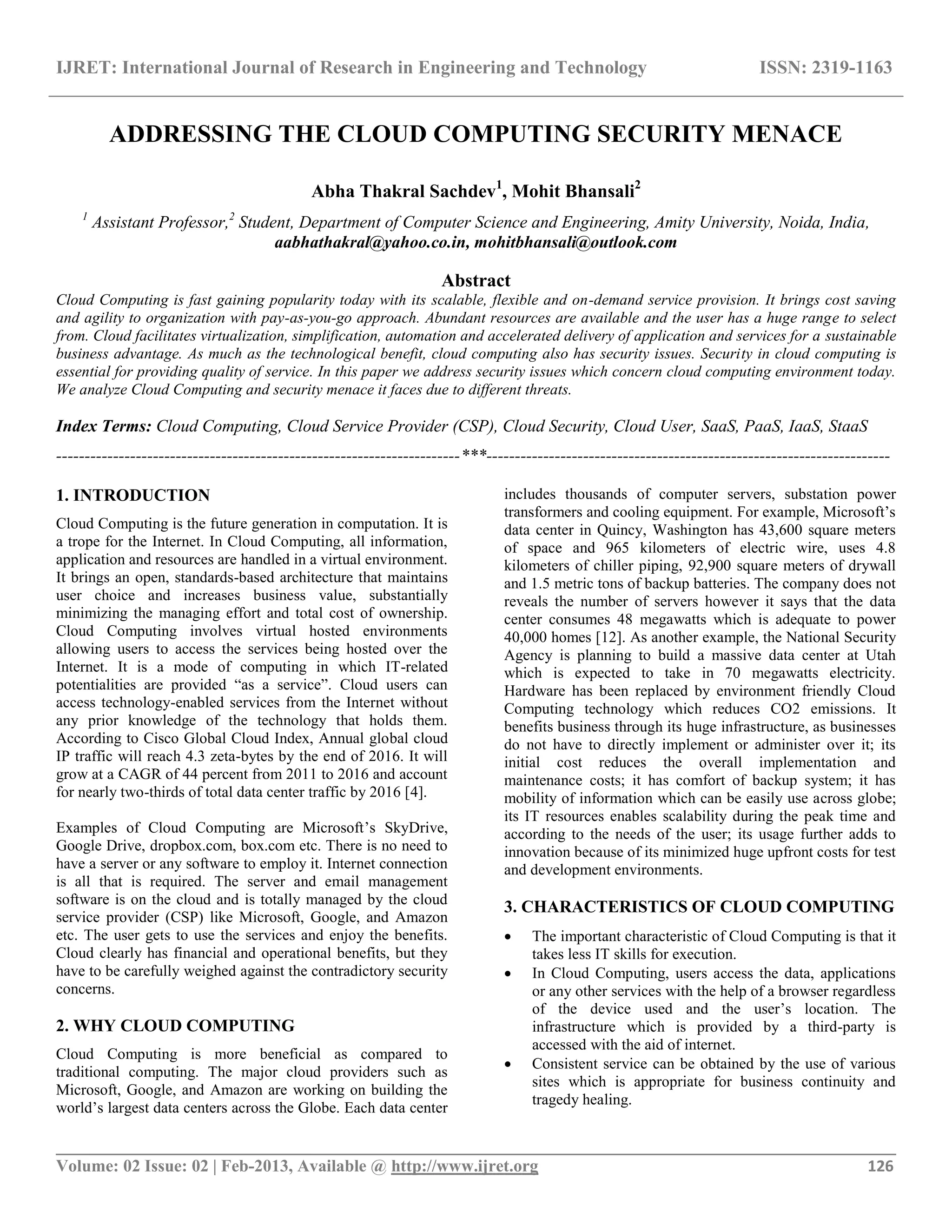 This document summarizes security issues related to cloud computing. It begins by introducing cloud computing and its benefits like scalability, flexibility and cost savings. However, cloud computing also faces security risks due to its multi-tenant architecture, where resources are shared among multiple users. Specific security risks discussed include data loss and leakage if strong encryption and access controls are not implemented. The open accessibility of cloud services also makes it easier for malicious users to attack innocent users. Finally, proper identity management is needed to securely manage access across different cloud technologies and services.