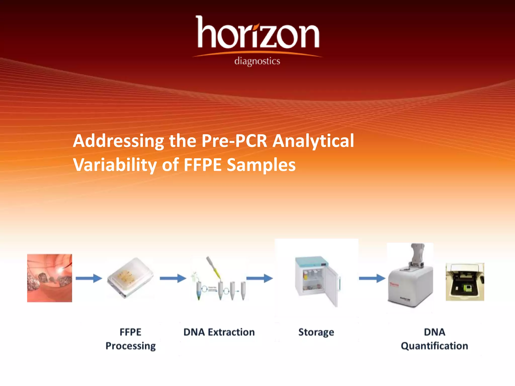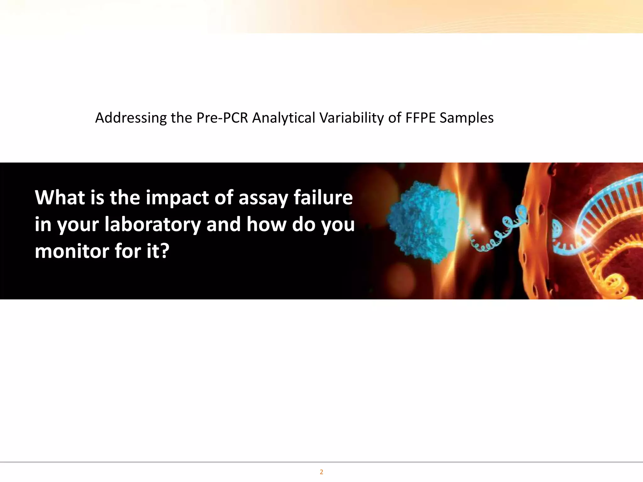 The document discusses the challenges of pre-PCR analytical variability in FFPE samples, emphasizing the impact of assay failures and the importance of monitoring methods. It highlights various extraction techniques and their differing efficiencies, along with the effect of formalin fixation on DNA quantification. The use of validated cell line reference standards as external controls is recommended to improve diagnostic accuracy and reliability.
