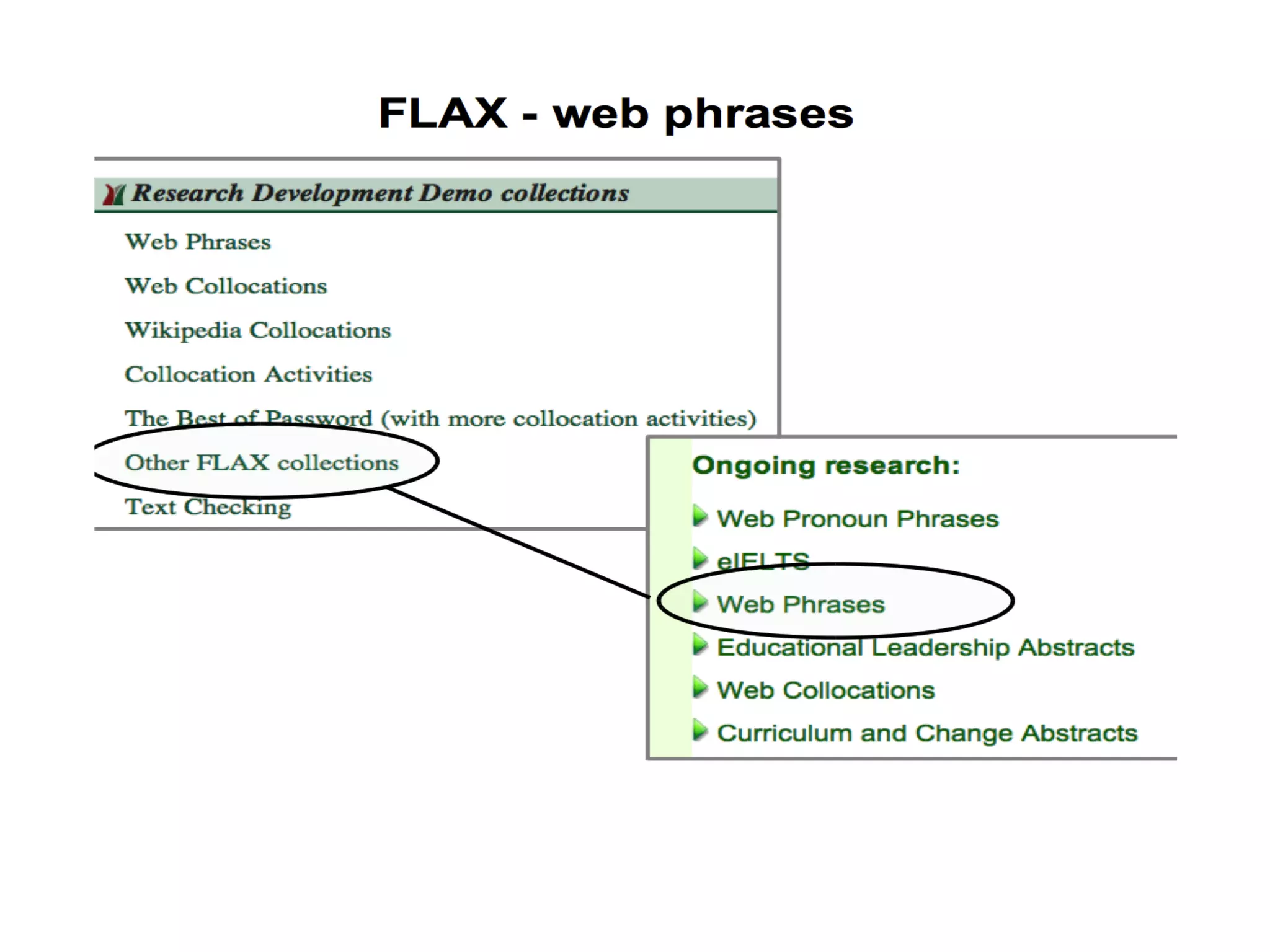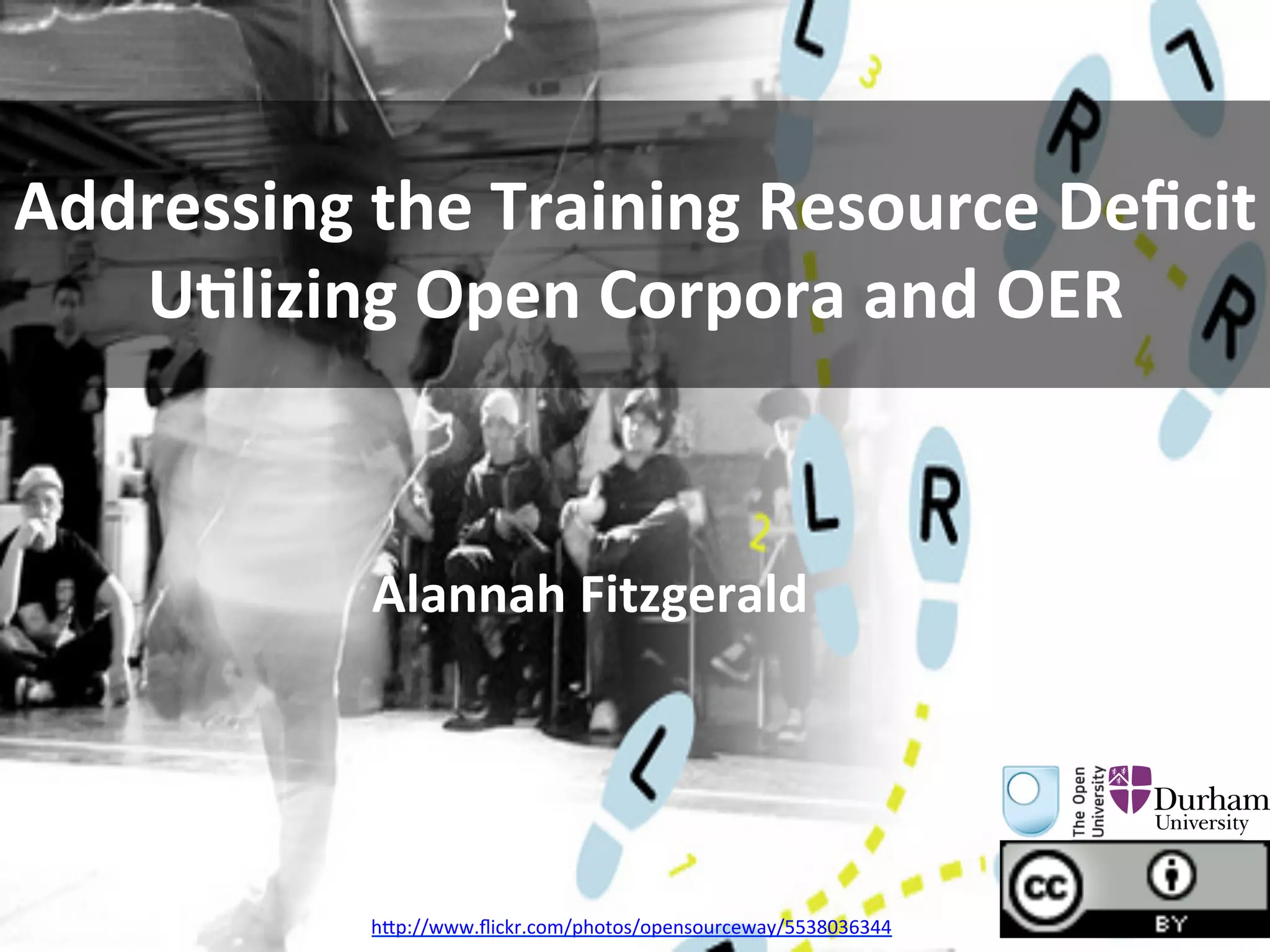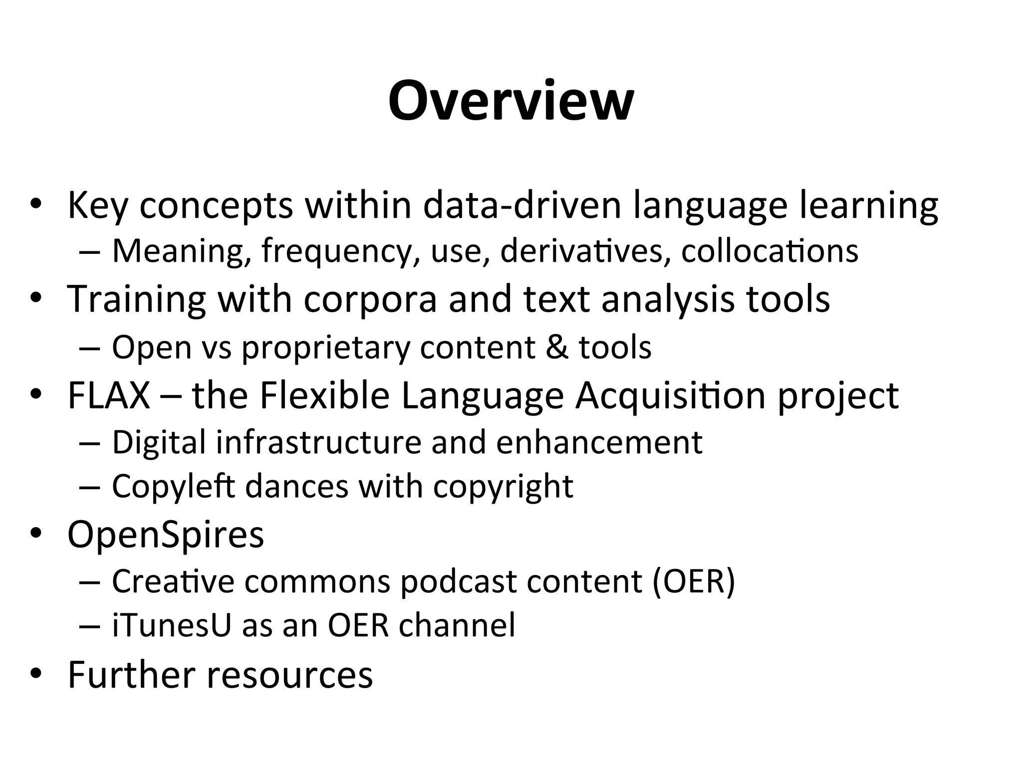This document discusses using open corpora and open educational resources (OER) to address deficits in language training resources. It introduces the Flexible Language Acquisition (FLAX) project, which utilizes digital tools and open web content to facilitate data-driven language learning through analysis of word meaning, frequency, usage, and collocations. It also describes OpenSpires, a repository of Creative Commons podcast content on iTunesU that can serve as an OER channel. Finally, it recommends several open-source text analysis tools and links to further OER resources that can be used to build customized corpora for language learning.
