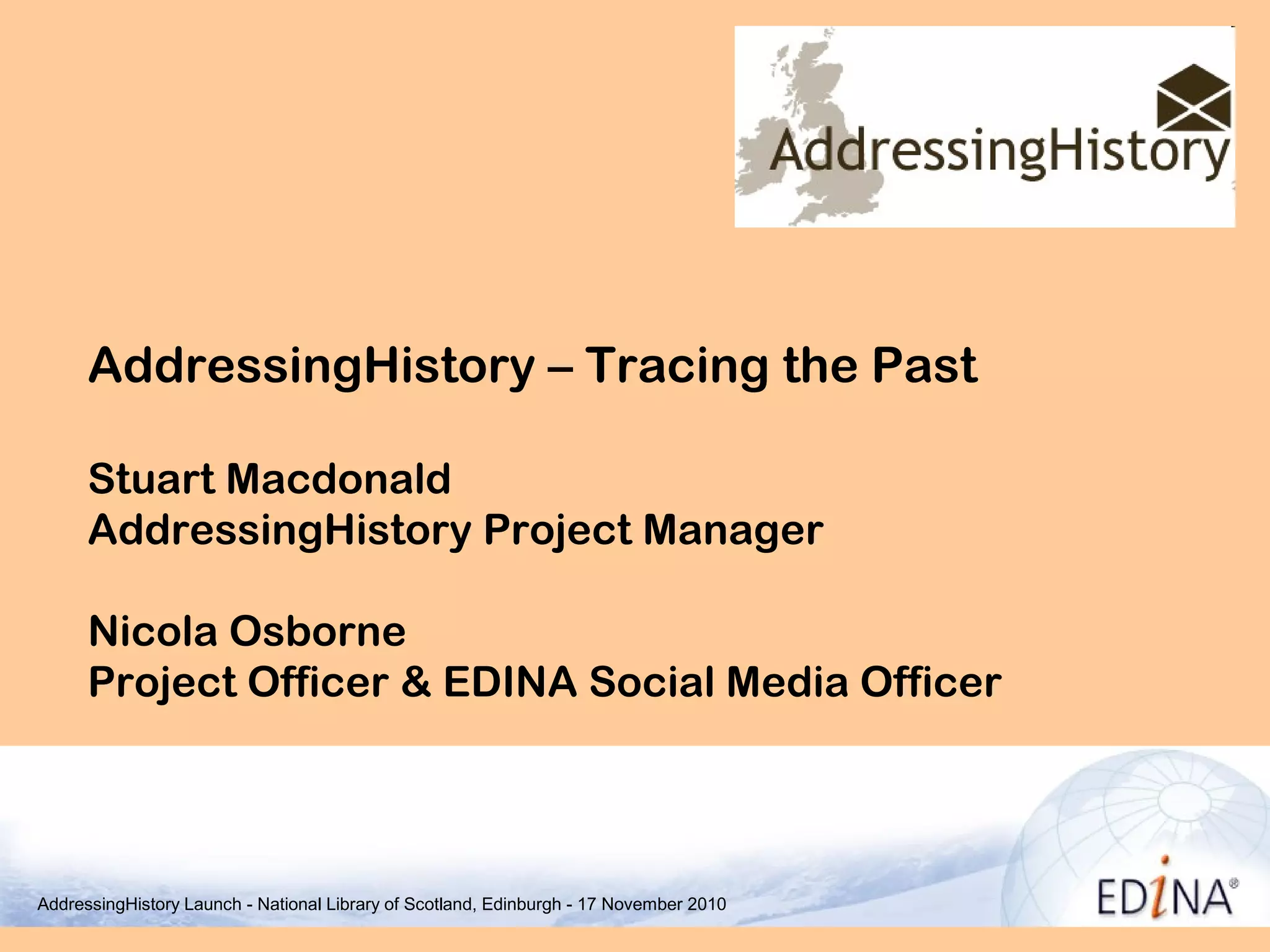 The document summarizes the AddressingHistory project, which aims to crowdsource the geocoding of historical Scottish postal directories by having users link directory entries to digitized historical maps. The project partnered with the National Library of Scotland to digitize directories from 1784-1805, 1865, and 1905-1906. It will develop an online tool allowing users to georeference directory entries by placing pins on digitized maps. The project will focus on engagement through social media channels and its blog. It recently launched its online tool and API and is now focused on sustainability and funding.