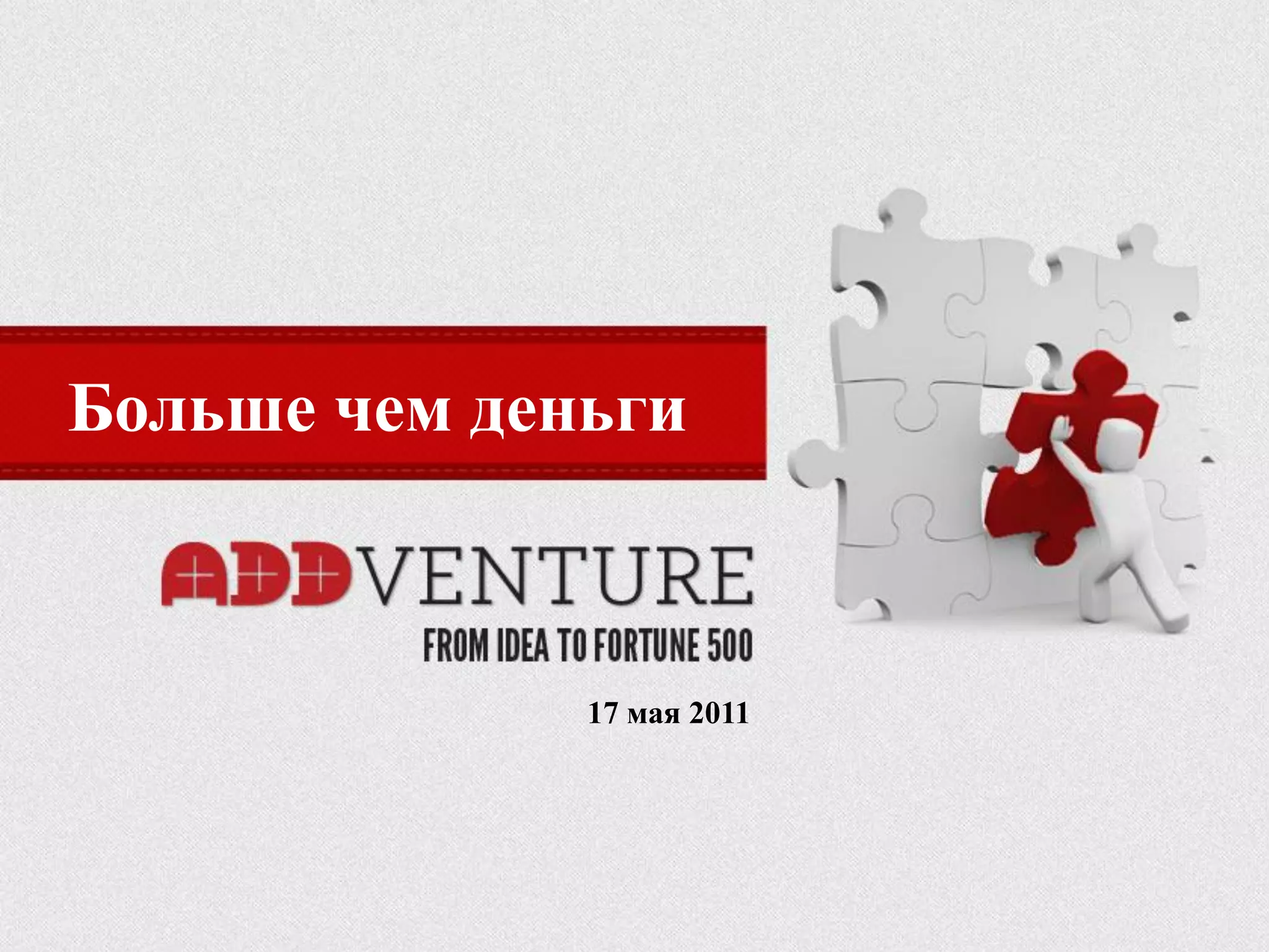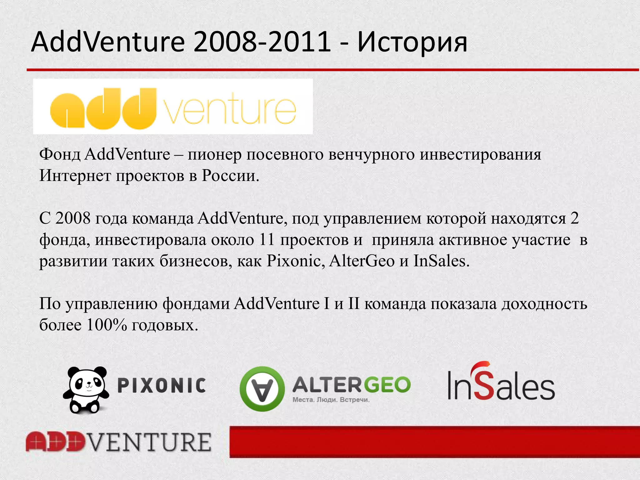 Документ представляет собой обзор деятельности фонда Addventure, специализирующегося на венчурном инвестировании в интернет-проекты в России с 2008 года, упоминая успешные инвестиции и достижения. Фонд запустил третий фонд в 2011 году, с планами инвестировать в 7-10 проектов в ближайшие годы, фокусируясь на сферах электронной коммерции, SaaS и мобильных приложениях. Документ также подчеркивает важность активного участия команды фонда в развитии проектов и наличие экспертизы для успешного капиталовложения.