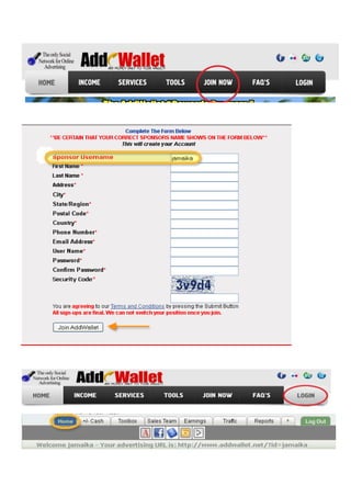 Addwallet is a new program similar to Zeek that allows members to purchase advertising credits (ad units) for $1 each to generate website views and earn daily revenue shares of 1-2% of the total amount purchased in ad units. Members can also upgrade their membership to silver ($10/month), gold ($50/month), or diamond ($100/month) to earn residual income from a 2x15 matrix plan and referral commissions from directly enrolling others. Addwallet is owned by an Ecuadorian company and aims to drive traffic and generate advertising revenue for its members.