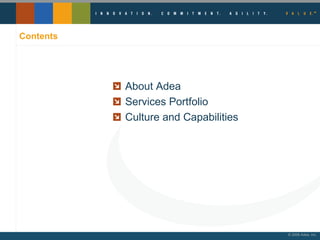 Adea is a global IT services, SAP and business consulting firm founded in 1996 with offices in the US, Europe, India and China. It has over 100 customers and 1500 consultants. Adea provides services across industries like technology, retail, telecom and government. It uses flexible delivery models like onsite, offshore and a hybrid model to provide cost-effective solutions while ensuring quality and timely delivery.