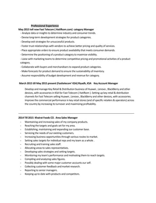 Adeeb Tarrab has over 9 years of experience in retail sales management and operations, primarily in consumer electronics. He currently holds a category manager role at Fast Telecom in Saudi Arabia where he is responsible for product categories, pricing, promotions, and vendor relationships. Prior to this, he held several senior sales and management positions in Saudi Arabia and Syria, including as a senior section manager at Carrefour and area sales manager. He is seeking a new career opportunity where he can utilize his retail expertise.