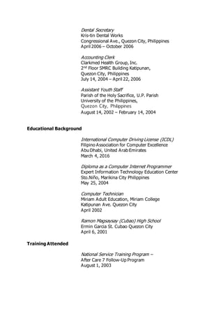 Adela Capilo is seeking a new job opportunity where she can share her knowledge and help others achieve team goals. She has over 10 years of work experience in roles like sales, customer service, administration, and secretarial work in the Philippines and UAE. Her educational background includes an International Computer Driving License and a diploma in computer programming. She is proficient in Microsoft applications and data entry.