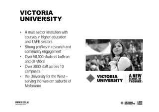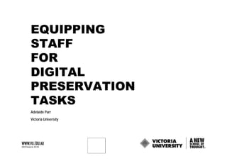 The document discusses equipping staff at Victoria University for digital preservation tasks. It outlines the university's decentralized records management approach and issues like inconsistent disposal, storage, and identification of records. It emphasizes defining skillsets and responsibilities, developing training programs for different staff groups, and providing ongoing post-training support. Training includes topics like electronic records, disposal frameworks, and identifying records champions in each area to support colleagues. The goal is to give staff the skills needed to properly manage records throughout their lifecycle in accordance with legislative requirements.