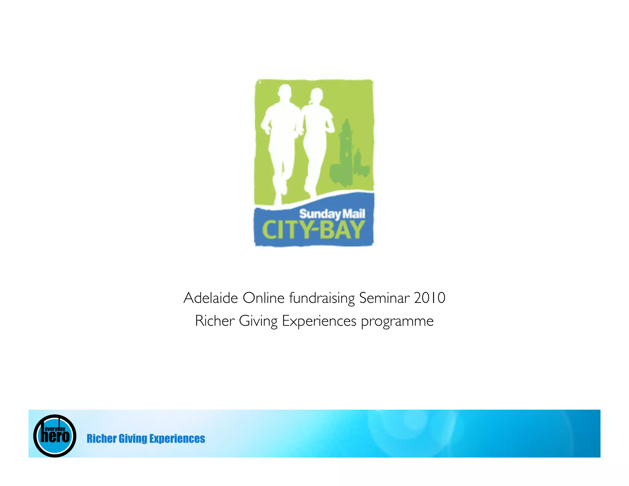 This document discusses tools and a program to help charities enrich fundraisers' experiences and encourage more donations. The program involves 3 steps: 1) recruiting more fundraisers through emails, 2) motivating fundraisers with thank you calls and emails, and 3) thanking donors and encouraging them to support the charity directly. The goal is to acquire more fundraisers, engage them more, and convert donors into long-term charity supporters.