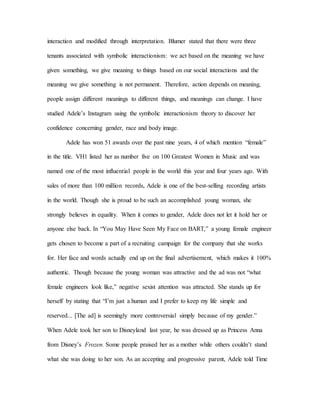 Adele Adkins is an English singer and songwriter who has experienced both privilege and oppression regarding gender, race, and body image. Through her Instagram photos, she displays empowerment in her talents and influences while also finding enjoyment in inner peace and living in the moment. According to the symbolic interactionism theory, Adele derives meaning from her social interactions and life experiences. She acts based on these meanings while staying true to herself regardless of others' criticisms.
