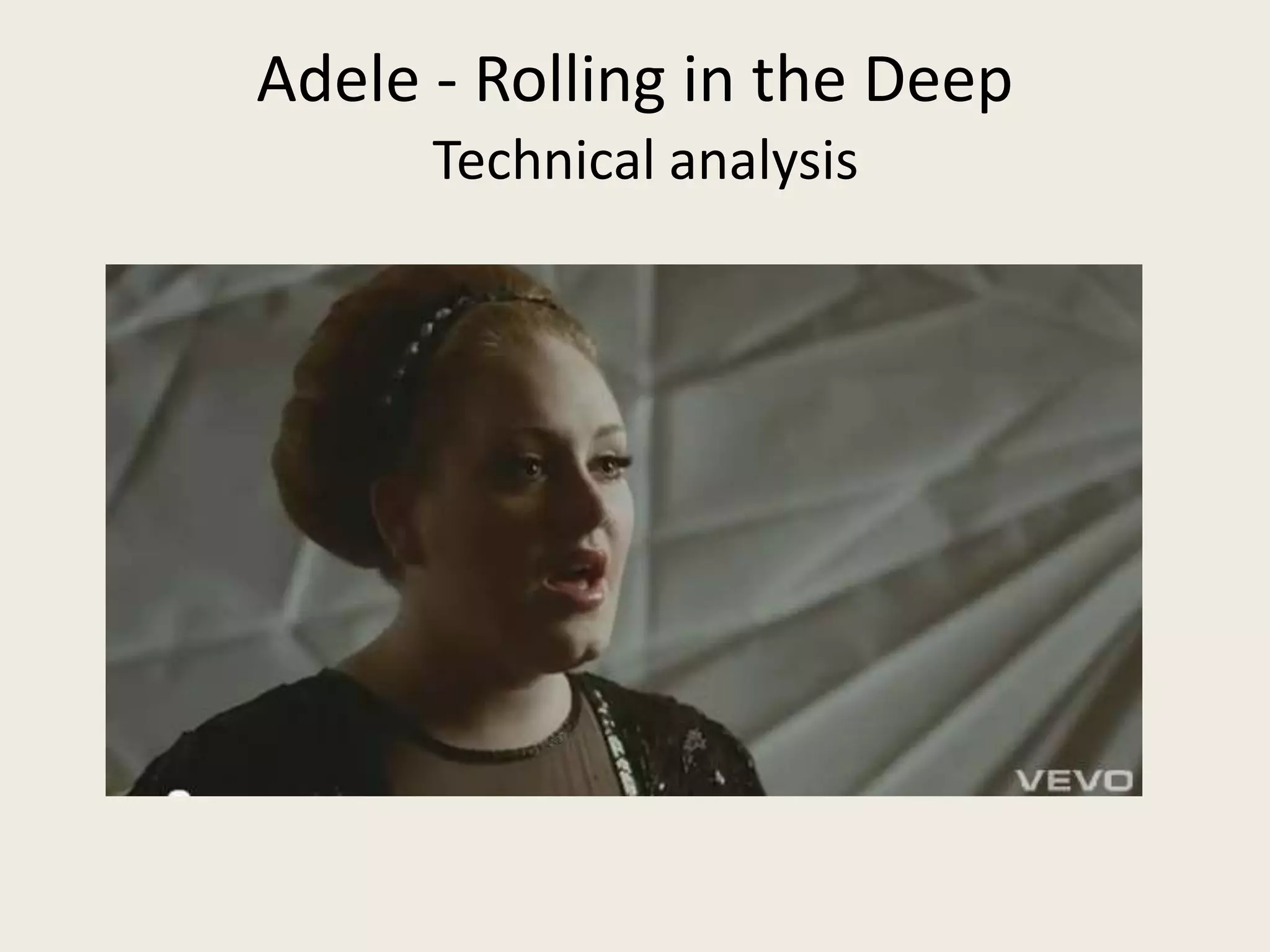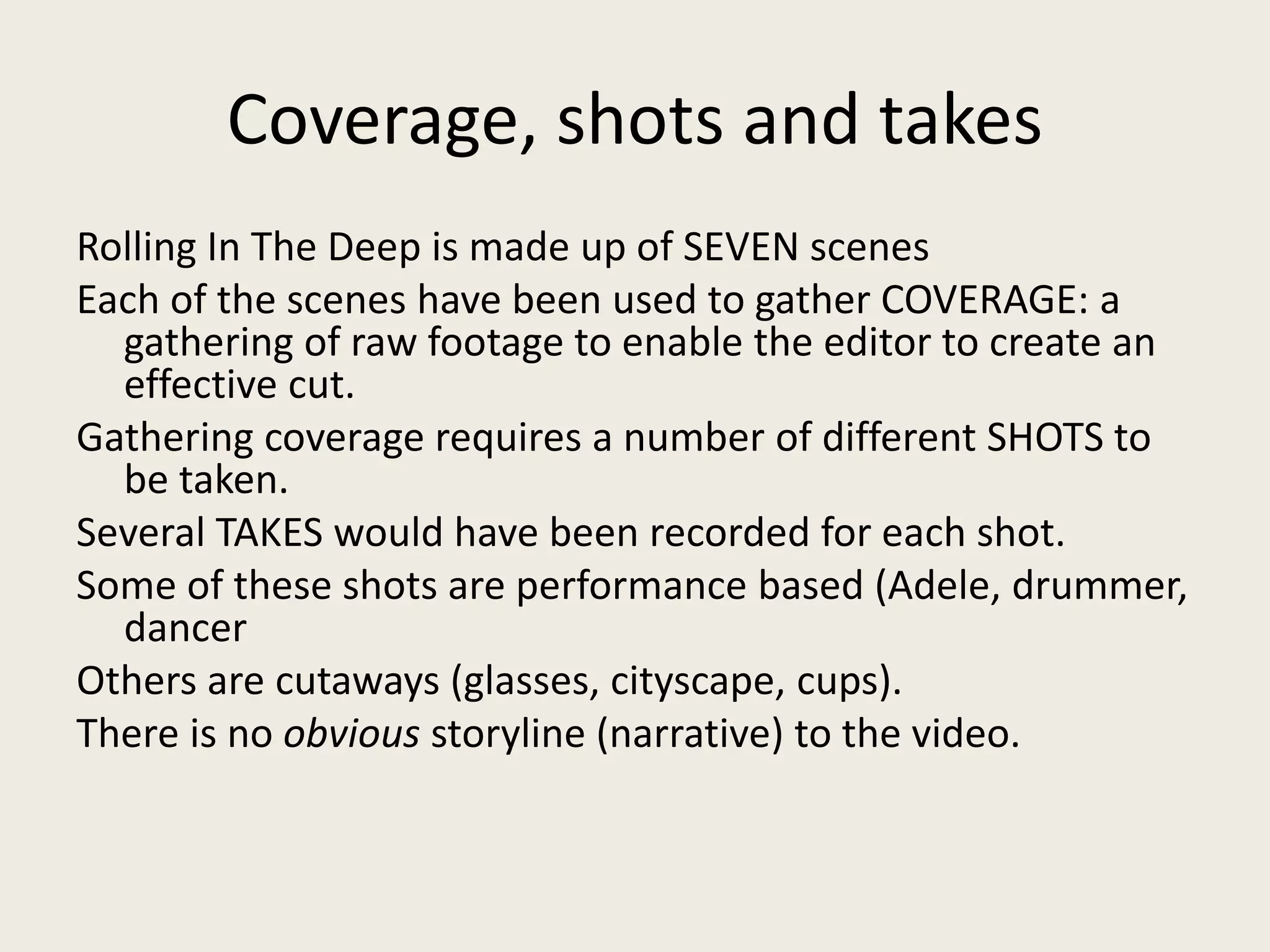 The music video for Adele's "Rolling in the Deep" consists of seven scenes that were filmed to gather coverage for the editor. Each scene contains different shots that were recorded in multiple takes to provide raw footage. The scenes include Adele singing in an elegant room, a dancer in a military uniform, a drummer under stairs, close ups of glasses filling with water, cups being smashed against a screen, explosions destroying a model city, and a close up of a fresco. There is no obvious narrative to the video.