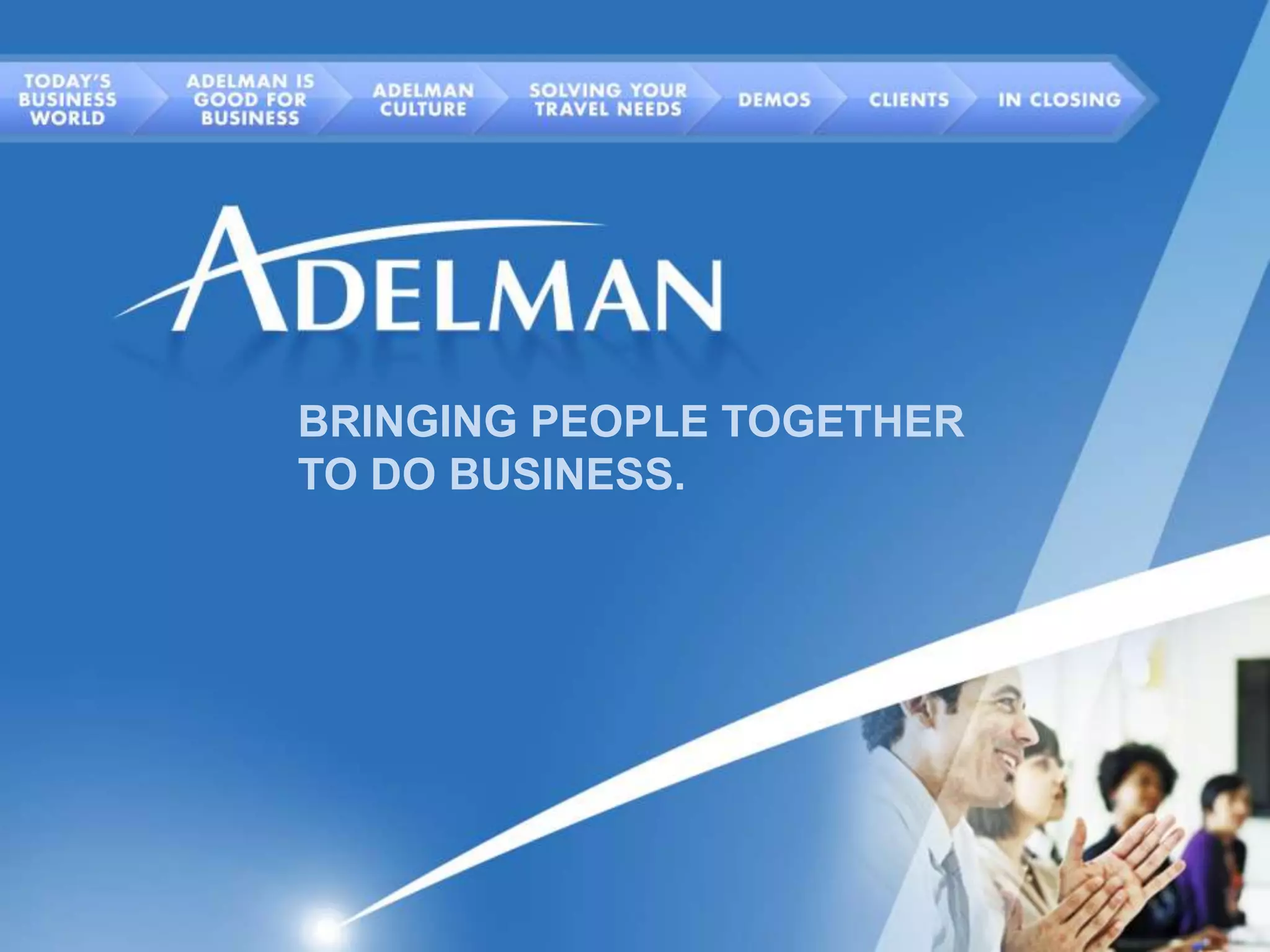 This document summarizes Adelman's travel management services. Adelman has over 30 years of experience in the travel industry and focuses on bringing people together to do business through travel. They provide customized solutions and consultative account management to meet each client's unique needs. Adelman develops proprietary software and tools to automate services, provide security and safety, and help clients consolidate their global travel programs.