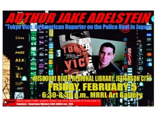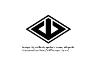 The Yamaguchi-gumi is one of the largest Yakuza crime families in Japan, with over 20,000 members. It uses a spider web as its symbol. Jake Adelstein has reported on the Yamaguchi-gumi for various news outlets and appeared on the Daily Show to discuss his work covering Japan's organized crime groups. Lisa Campbell Ernst will be giving a talk at the MRRL Art Gallery on March 13th from 7-9pm about human trafficking.