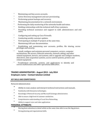 This document contains the resume of Olajide Ibrahim Adeluwoye, who has over 2 years of experience as a Network/System Administrator. He is currently working as a Network Administrator for Contact Solutions Limited, where his responsibilities include installing, configuring, and maintaining servers and network equipment. Prior to his current role, he worked as a Trainee Administrator for Contact Solution Limited from August 2013 to July 2014. He has expertise in areas like network administration, infrastructure support, and operating system migrations. He holds a BSc Hons in Electronic and Electrical Engineering from Obafemi Awolowo University.