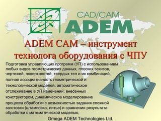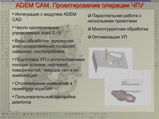 Документ описывает функциональные возможности программного обеспечения adem cam, которое предназначено для подготовки управляющих программ для оборудования с ЧПУ. Включает поддержку различных видов обработки, таких как токарная, фрезерная и электроэрозионная, и обеспечивает ассоциативность между геометрическими и технологическими моделями. Также предусмотрена автоматизация процессов и пользовательская настройка диалогов.