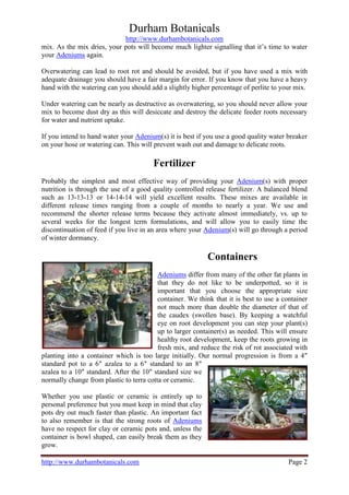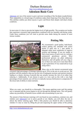 The document provides care instructions for Adenium plants, commonly known as desert roses. It recommends providing the highest level of light, a well-draining potting mix amended with perlite, and thorough watering until the soil is saturated. A controlled release fertilizer should be used and plants should be repotted as needed into progressively larger containers to encourage healthy root growth. The shape and size of the container can influence the formation of the caudex, or swollen base, of the plant.
