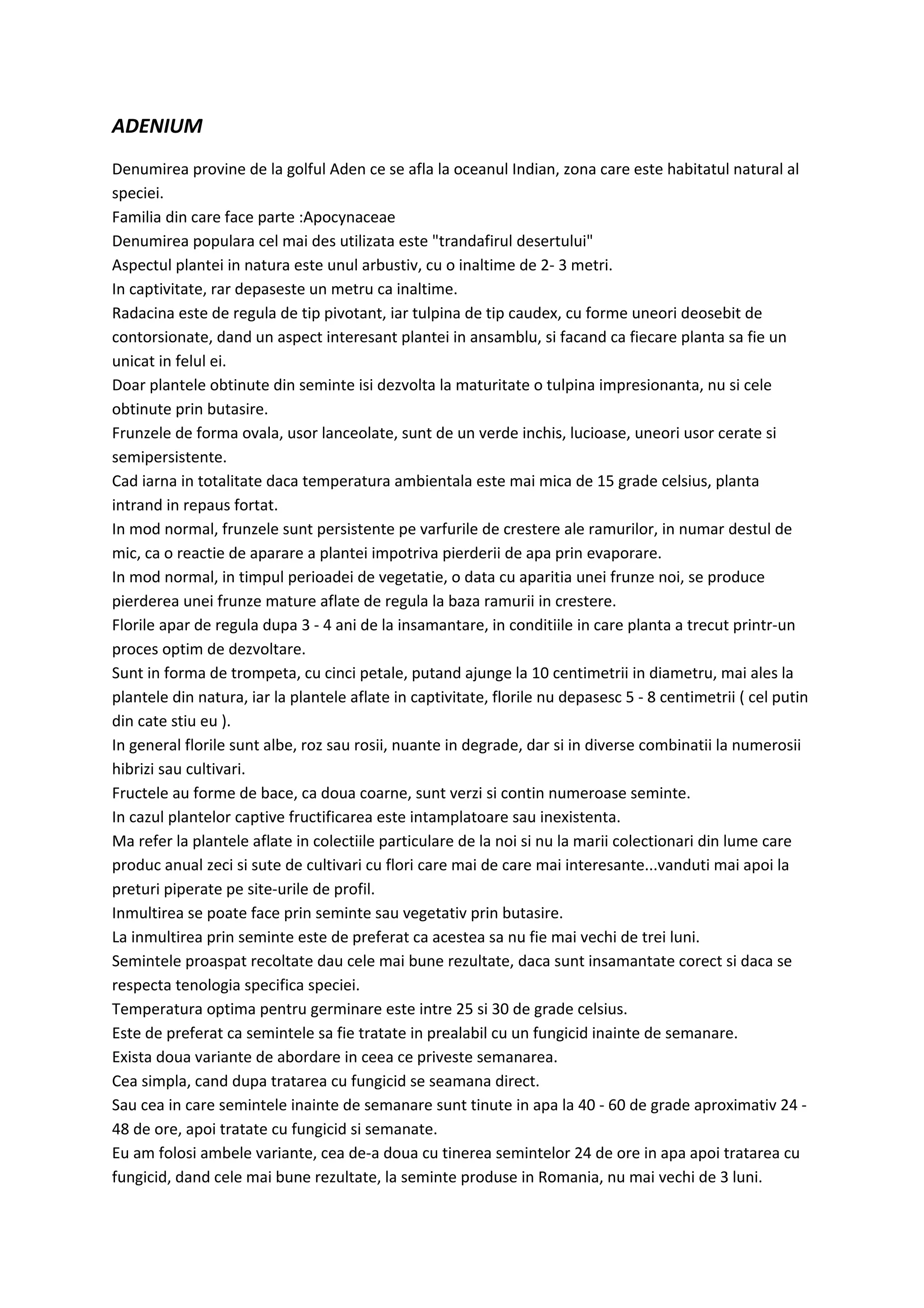 Adenium, cunoscut și sub numele de 'trandafirul desertului', este o plantă originară din zona Golfului Aden, caracterizată prin aspectul său arbustiv și tulpina contorsionată. Aceasta poate fi înmulțită prin semințe sau butași, dar doar plantele din semințe dezvoltă tulpini impresionante la maturitate. Florile variate, în nuanțe de alb, roz sau roșu, apar de obicei după 3-4 ani și planta necesită condiții de creștere optime, inclusiv expunere la soare, pentru a se dezvolta corect.