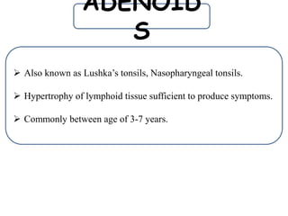 The document discusses adenoid hypertrophy, which commonly occurs in children ages 3-7. It causes nasal obstruction and symptoms like mouth breathing, snoring, ear infections, and speech problems. Examination findings include adenoid facies and nasal discharge. Diagnosis involves endoscopy to grade the adenoid size. Treatment is typically adenoidectomy to remove the enlarged adenoids.
