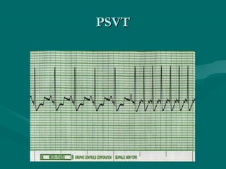 Adenosine is used to terminate supraventricular tachycardia (PSVT) involving the atrioventricular node by rapidly administering 6-12 mg intravenously over 1-3 seconds. It works in over 90% of cases by activating potassium channels to hyperpolarize cell membranes in the sinoatrial node, atria, and atrioventricular node, indirectly reducing calcium current and blocking the reentrant circuit through the atrioventricular node. Adenosine has advantages over verapamil in being more effective, having an action under 1 minute, avoiding hemodynamic deterioration, and being safer for wide complex tachycardias.
