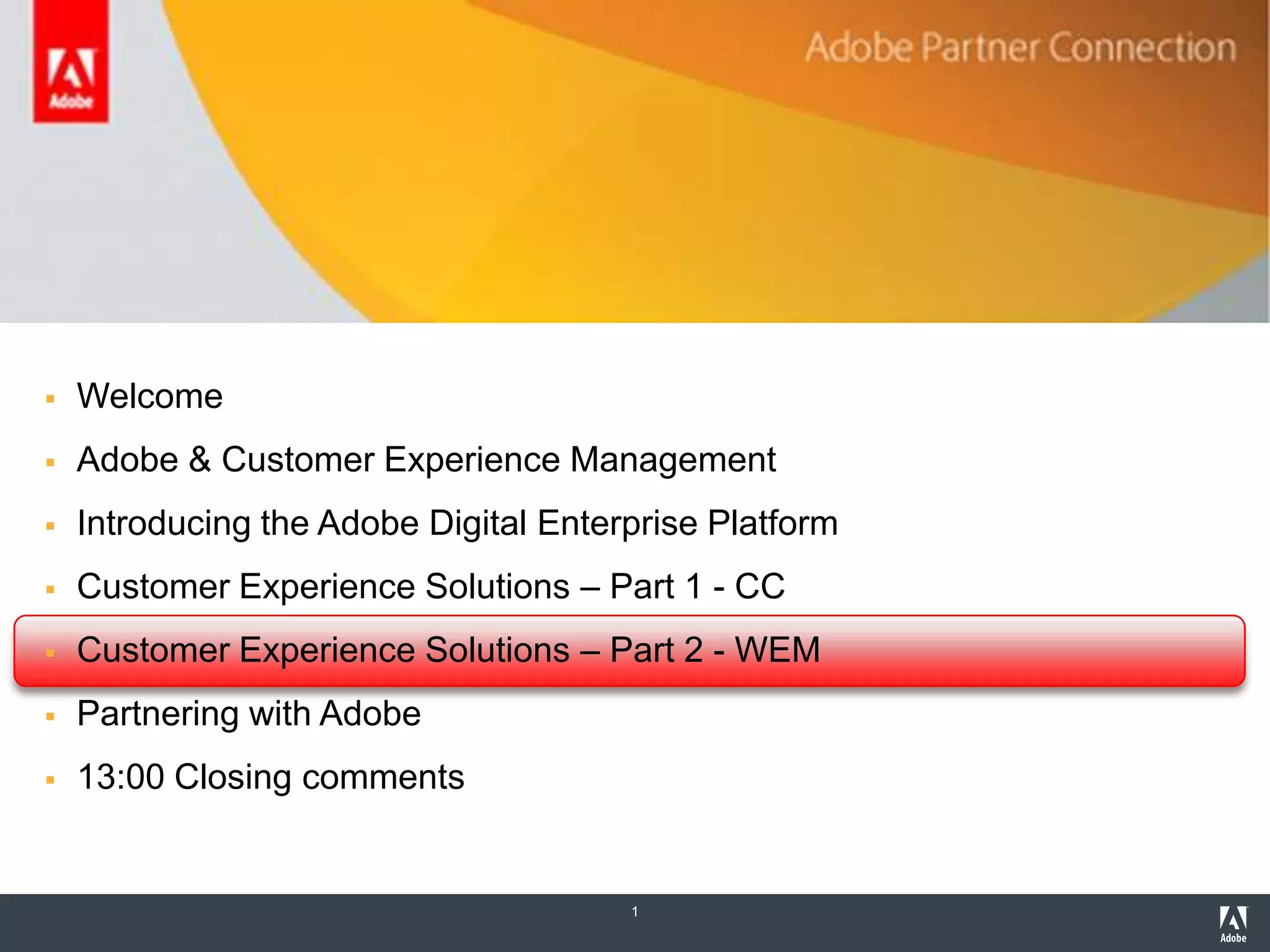 The document outlines an agenda for a presentation on Adobe's customer experience solutions and digital enterprise platform. The agenda includes introductions to Adobe and customer experience management, presenting Adobe's customer experience solutions and digital platform, and partnering opportunities. The presentation aims to demonstrate how Adobe's solutions can help organizations optimize their customer experience across digital channels.