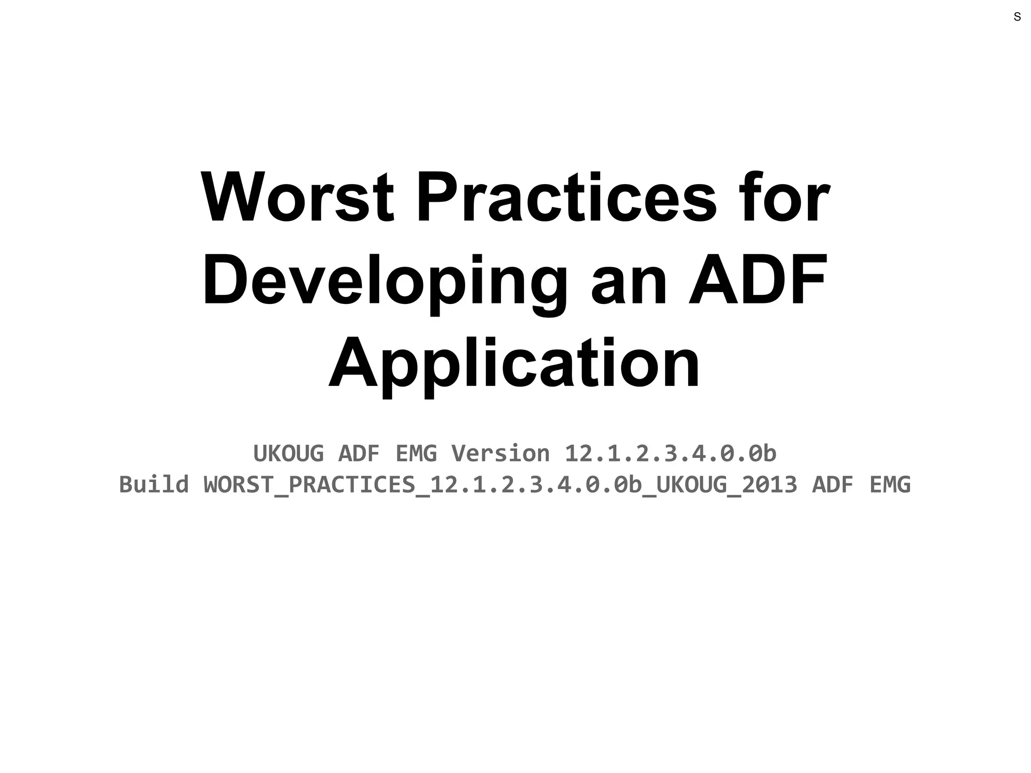 The document outlines best and worst practices for developing ADF applications, focusing on challenges faced by various roles including developers and graphic designers. Key issues highlighted include adherence to coding guidelines, proper use of memory scopes, and effective debugging techniques. It emphasizes the importance of collaboration among team members to maintain quality and performance in ADF projects.
