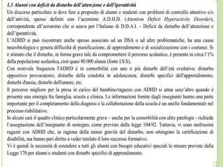 Il documento analizza il Disturbo da Deficit di Attenzione e Iperattività (ADHD), descrivendone i sintomi principali come disattenzione, iperattività e impulsività, e i criteri diagnostici secondo il DSM-5. Vengono esplorati i fattori eziologici, le conseguenze sulla vita quotidiana e scolastica dei bambini affetti, le false credenze comuni riguardo all'ADHD e le difficoltà relazionali, scolastiche e comportamentali legate al disturbo. Inoltre, il documento illustra l'evoluzione dell'ADHD dall'infanzia all'età adulta e i possibili indicatori di rischio per insegnanti e genitori.
