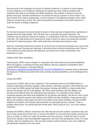 The document discusses Attention Deficit Hyperactivity Disorder (ADHD), detailing its types, causes, diagnosis, and treatment options. It highlights the challenges faced by families of children with ADHD and emphasizes the importance of tailored treatments that may include medication and behavioral training. Living with ADHD requires organization and support, as the condition can significantly impact family dynamics and relationships.