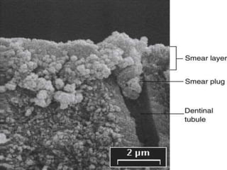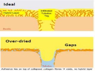 Adhesion in dentistry involves bonding dental materials such as composites to tooth structure. There are two main types of adhesion - chemical and micromechanical. Chemical adhesion involves bonding between tooth and material molecules while micromechanical adhesion uses surface irregularities created by etching to mechanically interlock the material. Factors like surface energy and cleanliness influence adhesion. Conditioning times for enamel and dentin can affect bond strength, with some studies finding extended times increase strength for dentin but not enamel. High quality adhesion improves restoration retention and resistance to leakage and fracture.