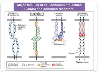 This document discusses different types of cell adhesion molecules (CAMs) and adhesion receptors. It describes several major families of CAMs, including cadherins, integrins, selectins, and neural cell adhesion molecules (N-CAMs). Cadherins are calcium dependent and help bind embryonic cells together. Integrins are receptors that bind the extracellular matrix and require calcium or magnesium. Selectins contain carbohydrate-binding domains and recognize sugar structures on adjacent cells. N-CAMs mediate cell-cell recognition and adhesion during neural tissue formation. The cytoplasmic domains of these adhesion molecules link them to the cytoskeleton or signaling pathways.