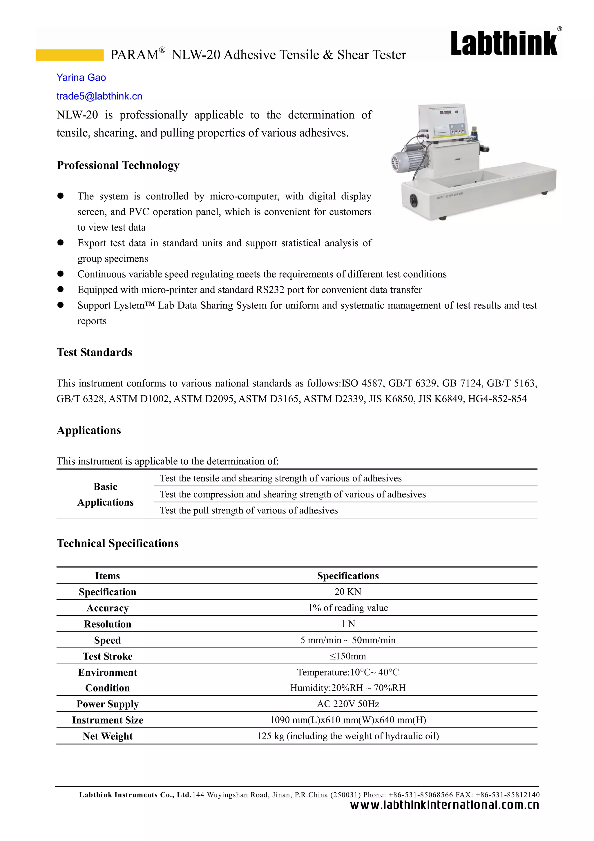 The NLW-20 adhesive tensile and shear tester is designed for determining the tensile, shearing, and pulling properties of adhesives using a micro-computer controlled system with digital displays for ease of use. The device supports various national test standards and includes features like continuous variable speed regulation, data export capabilities, and a micro-printer for results documentation. It is suitable for multiple adhesive testing applications and has precise specifications for operational conditions.