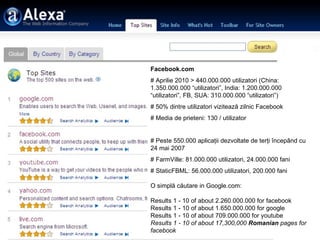 În aprilie 2010, Facebook avea peste 440 milioane de utilizatori, cu o penetrare de 6% în România și un potențial de creștere semnificativ. Companiile mari investesc masiv în Facebook pentru promovare, transformând rețeaua personală în B2C. Facebook este evaluat la 11,5 miliarde de dolari, iar aplicațiile românești sunt în număr redus, doar 5-10.