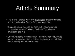 Mark King, the head of Adidas America, values innovation and empowering employees. He sees room to improve the company's culture, which already emphasizes these traits. King encourages new ideas through an online training program and projects that gather workers' input. Adidas strives to closely connect with customers through authentic brand experiences. It focuses on its core business of quality athletic products rather than diversifying widely. The company exhibits both unified purpose and diversity to promote innovation.