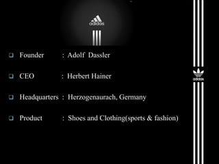 Adidas was founded in 1948 by Adolf Dassler in Germany and is a major manufacturer of athletic shoes and clothing. The company's mission is to be the global leader in sporting goods through high-quality products and strengthening their brands. Adidas strives to improve social and environmental performance in their supply chain. They produce a wide range of sporting goods, footwear, clothing, and accessories and sponsor major sporting events around the world.