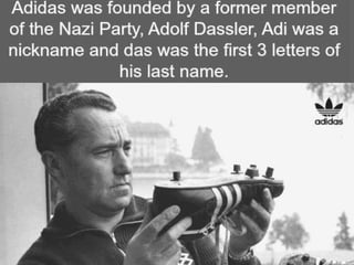 Adidas is a German multinational corporation founded in 1949 that designs and manufactures sports clothing and accessories. It was founded by Adolf "Adi" Dassler and is headquartered in Herzogenaurach, Germany. Adidas has two major competitors, Puma and Nike. It has grown significantly over the years through strategic acquisitions such as Reebok and by sponsoring major sporting events and athletes. The three parallel stripes are the well-known logo and brand identity of Adidas.