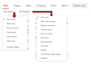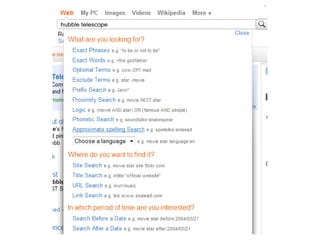 This document provides an overview of advanced internet searching techniques, including different types of search engines and their features. It discusses tools available on major search engines like Google, Bing, and Yahoo as well as specialty search engines for images, videos, news, blogs and more. Basic and advanced search options are explained for refining search queries. Finally, emerging social search engines and trends in online searching are mentioned.