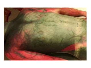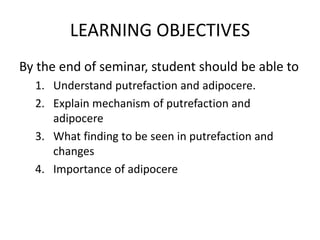 This document discusses putrefaction and adipocere formation after death. It explains that putrefaction begins breakdown of the body through autolysis and bacterial action within 12-72 hours of death. Changes include discoloration and gas formation, leading to effects like balloning. In optimal damp and warm conditions, adipocere formation can occur within 3 weeks, arresting putrefaction and preserving facial features and wounds in a wax-like material. The document aims to explain the mechanisms and findings of putrefaction and adipocere, and their importance for estimating time since death.