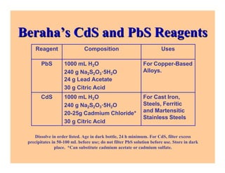 The document discusses the microstructure of austempered ductile iron (ADI) and methods for revealing its microstructure. ADI consists of graphite nodules, bainite (also called "ausferrite"), and retained austenite. Two reagents, Beraha's CdS and 10% sodium metabisulfite, are used to etch and reveal the microstructure under polarized light microscopy. The microstructure of ADI depends on the austempering temperature and time, with lower temperatures resulting in finer ausferrite needles and higher hardness.