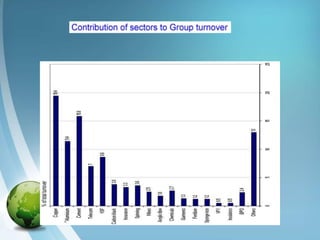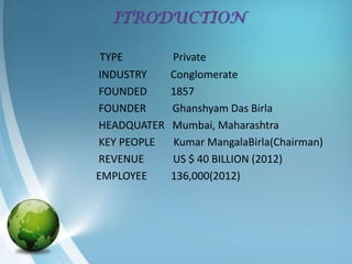 The document provides an overview of the Aditya Birla Group, an Indian conglomerate founded in 1857. It discusses the group's history and expansion starting in 1919. The group operates across multiple sectors including cement, metals, textiles, telecom, chemicals, financial services, and more. It has a presence in over 20 countries and over 136,000 employees. The group focuses on delivering value to customers, shareholders, employees and society. It has numerous subsidiaries and has undertaken several joint ventures and acquisitions to expand its operations.