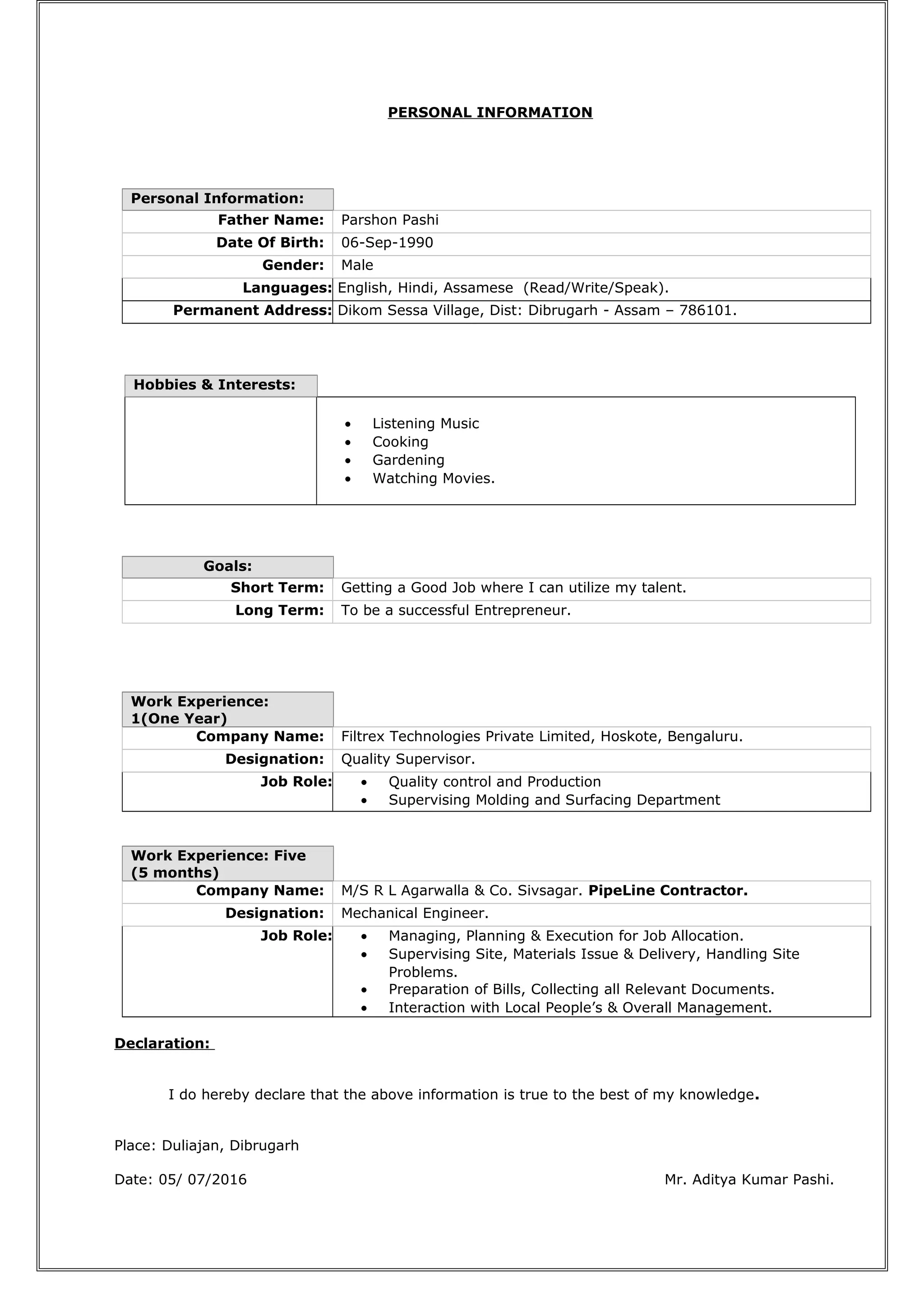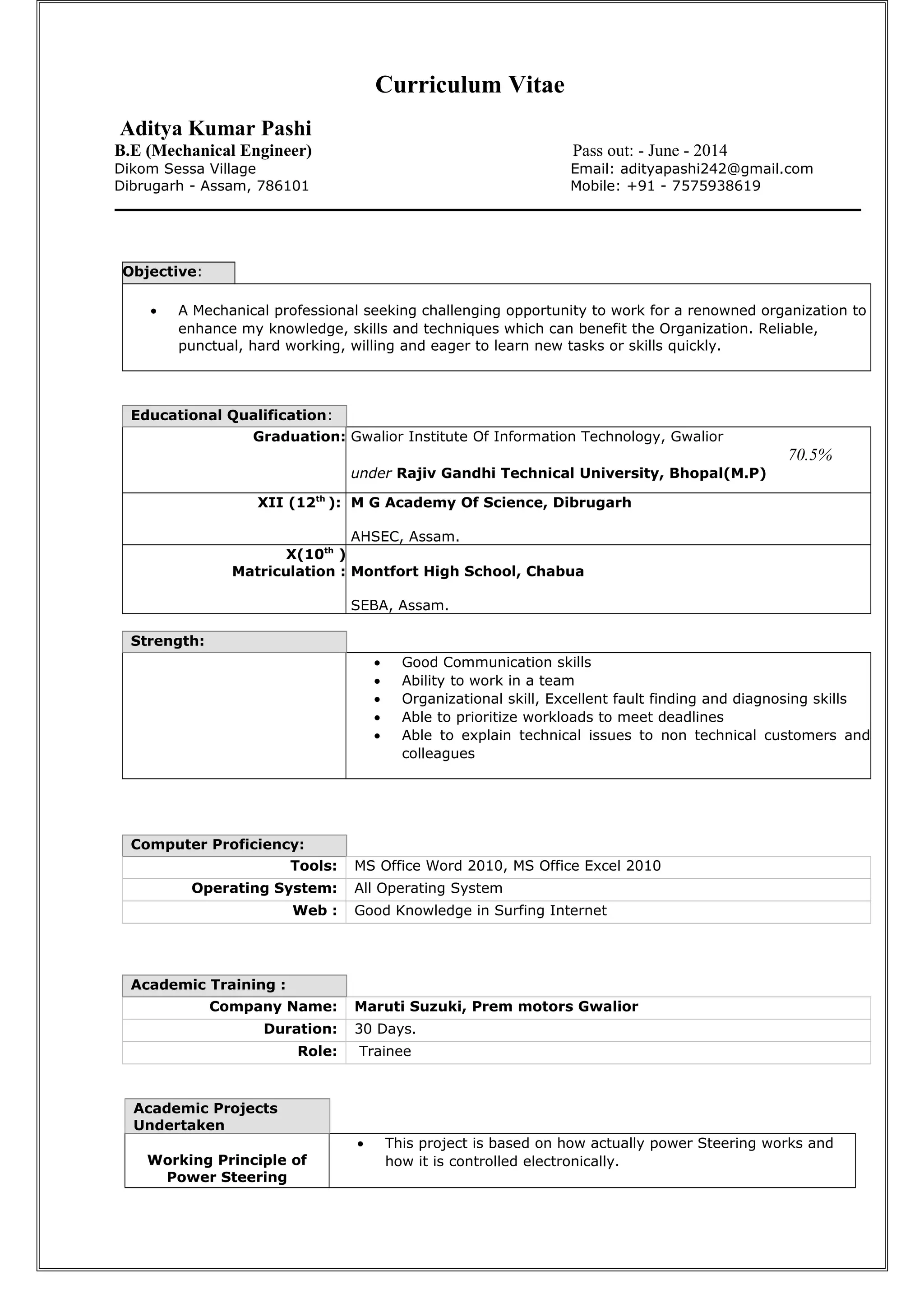 Aditya Kumar Pashi is seeking a challenging opportunity as a Mechanical Engineer. He has a B.E. in Mechanical Engineering from Gwalior Institute of Information Technology. He has 1 year of experience as a Quality Supervisor at Filtrex Technologies and 5 months of experience as a Mechanical Engineer at M/S R L Agarwalla & Co. His strengths include communication skills, teamwork, and the ability to explain technical issues simply.