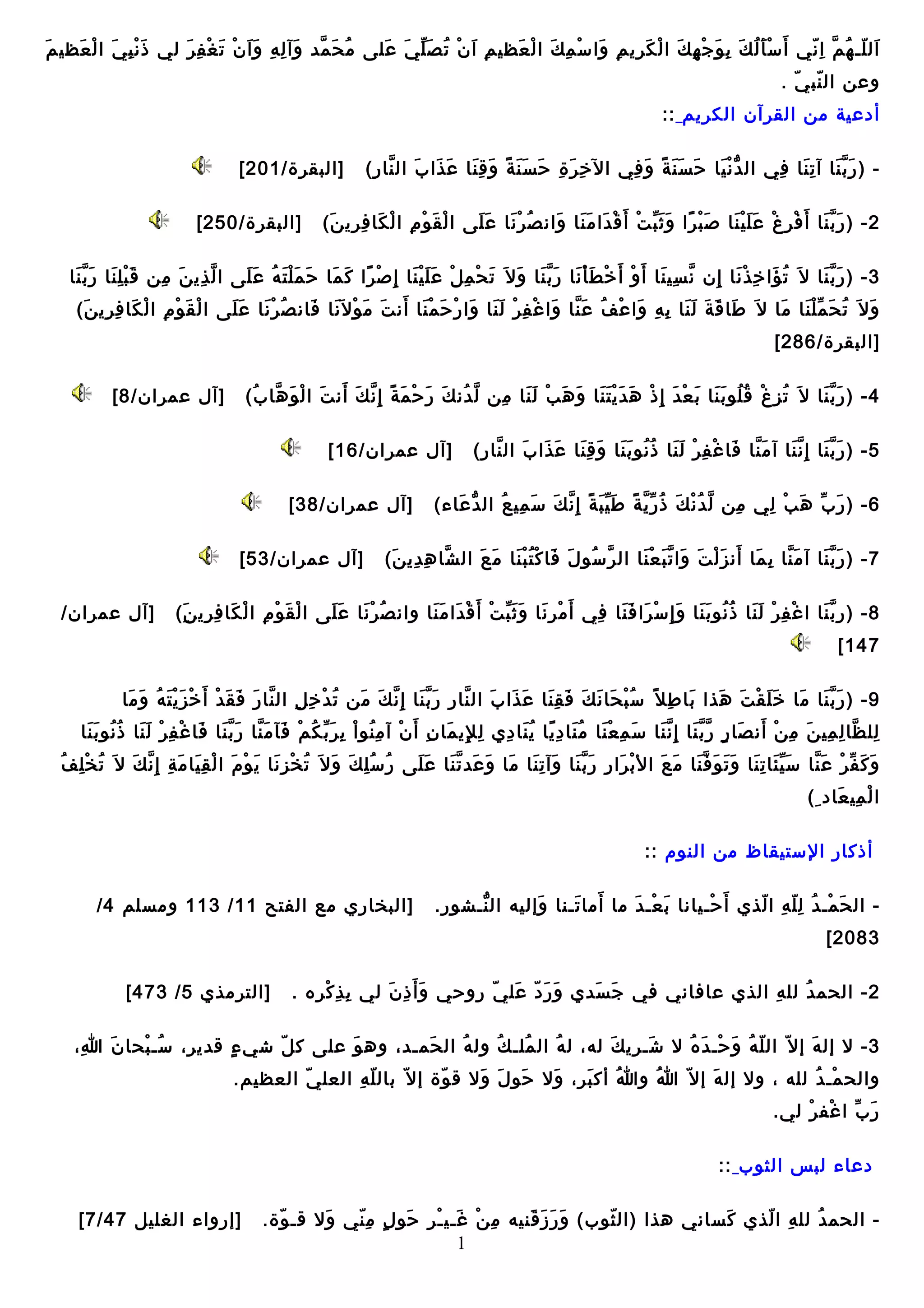 تحتوي الوثيقة على عدة أدعية وعبارات تتعلق بالتوجه إلى الله والطلب منه المغفرة والعون. تستعرض بعض الأدعية التي تتكرر في سياق استغفار المؤمنين وطلب الثبات في الدين. تقدم الوثيقة أيضًا ذكرًا لممارسات طقوسية معينة مثل الدعاء عند ارتداء الثوب أو دخول الخلاء.