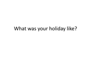 The document describes a holiday experience, with questions about the weather, hotel, town, and food, followed by positive and negative responses - the weather was either warm and sunny or foggy and cloudy/windy; the hotel was either luxurious and comfortable or dirty and uncomfortable; the town was either lovely or crowded and noisy; and the food was either delicious or disgusting, with one response saying the food was too disgusting to show.